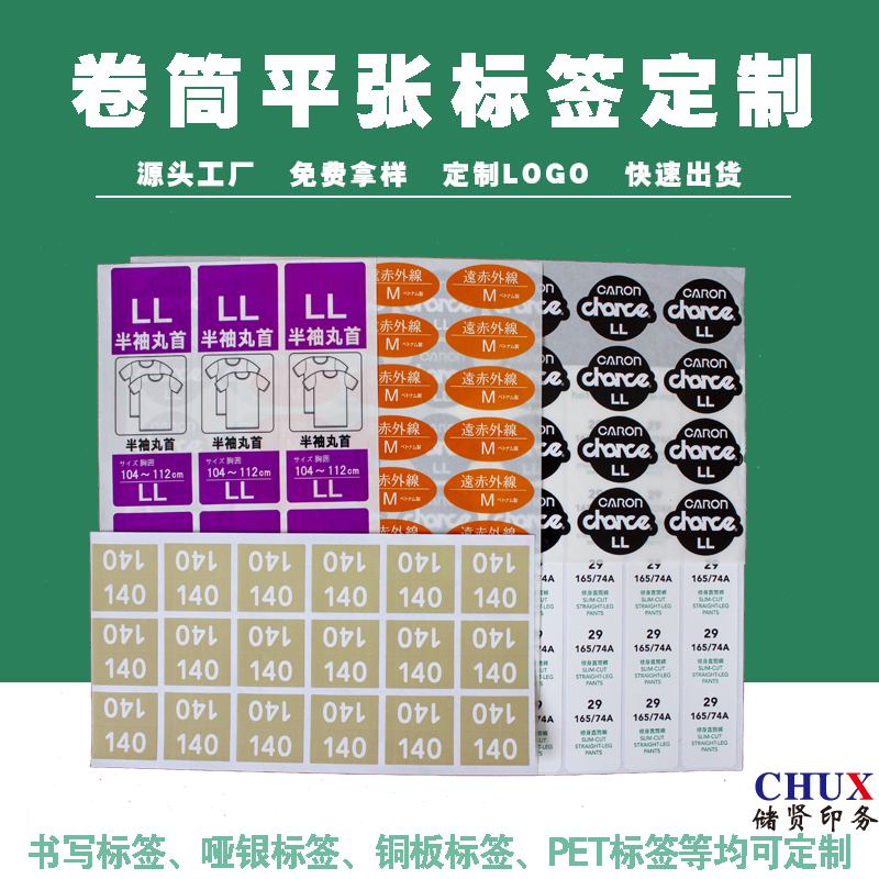 储贤牌的服装不干胶印刷彩色尺码透明标签储贤定制生产产品:估价:0.35,规格:四色,产品系列编号:四色 发布日期:2025-4-18